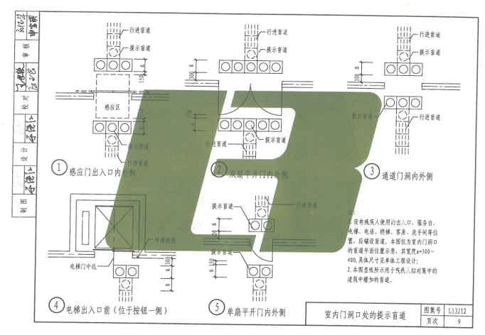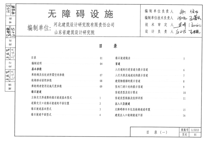 L13J12无障碍设施图集适用于新建、改建和扩建的城市道路、城市广场、城市绿地、居住区、居住建筑、公共建筑及历史文物保护建筑的物障碍设计选用。农村道路及公共服务设施的无障碍设计亦可按本图集选用。本图集设施适用于乘轮椅者、拄杖者、视力残疾者,并兼顾老年人及儿童使用。