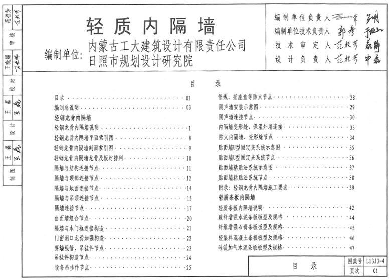 山东省13系列建筑标准设计图集之L13J3-4轻质内隔墙图集(以下简称为l13j34图集)是一份适用于新建、改建、扩建民用建筑与一般工业建筑的非承重内隔墙、隔断、框架结构内容填充墙。旧房隔墙改造可参照使用。本节内容东坡小编为大家整理带来的是一份pdf格式清晰电子版由124页组成的l13j34图集,欢迎有需要的朋友前来下载查阅!