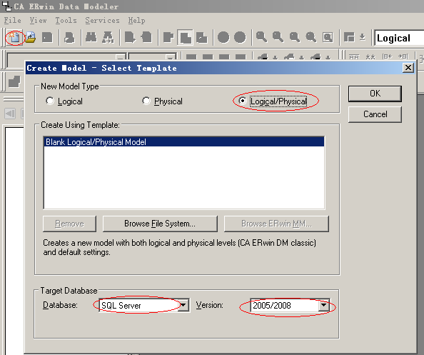 下面我们开始使用 ERwin。打开 ERwin,点击工具条上的“ Create Model”按钮,在弹出窗口中选择“ Logical/Physical”,目标数据库选择“ SQL Server”,版本选择 2005/2008(选择的数据库在后面过程中可以修改)。如图 2所示: