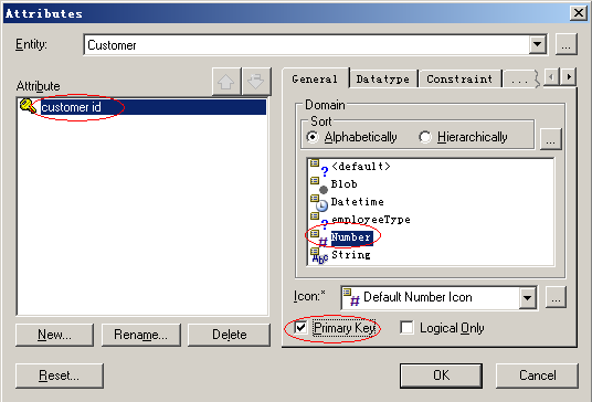 点击按钮“ New”来添加“ customer id” 属性,数据类型为 Number,并设为主键。如图 5所示。在该对话框中涉及到了“ Domain”这个概念,意思是具有相同数据类型的一组数据集合(有限多个,如省份的列表,或者无限多个,如电话号码等)。 ERwin中支持自定义 Domain,定义后可以在多个实体中使用,这样可以统一的表达属性的含义,并对属性数据进行验证。