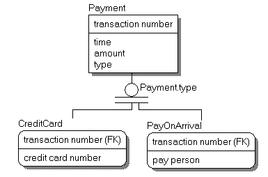 对于付款方式,我们想支持信用卡付款和货到付款(用 type属性区分),对于信用卡付款,系统记录客户的信用卡号;对于货到付款,记录付款人的名字。这两种付款方式可以看成是付款信息( Payment)的子类型,我们可以用_ ( sub-category)来定义这种关系,如下图: