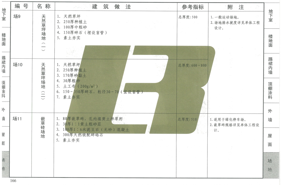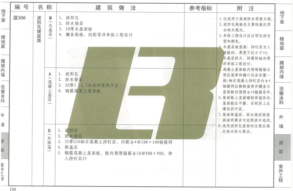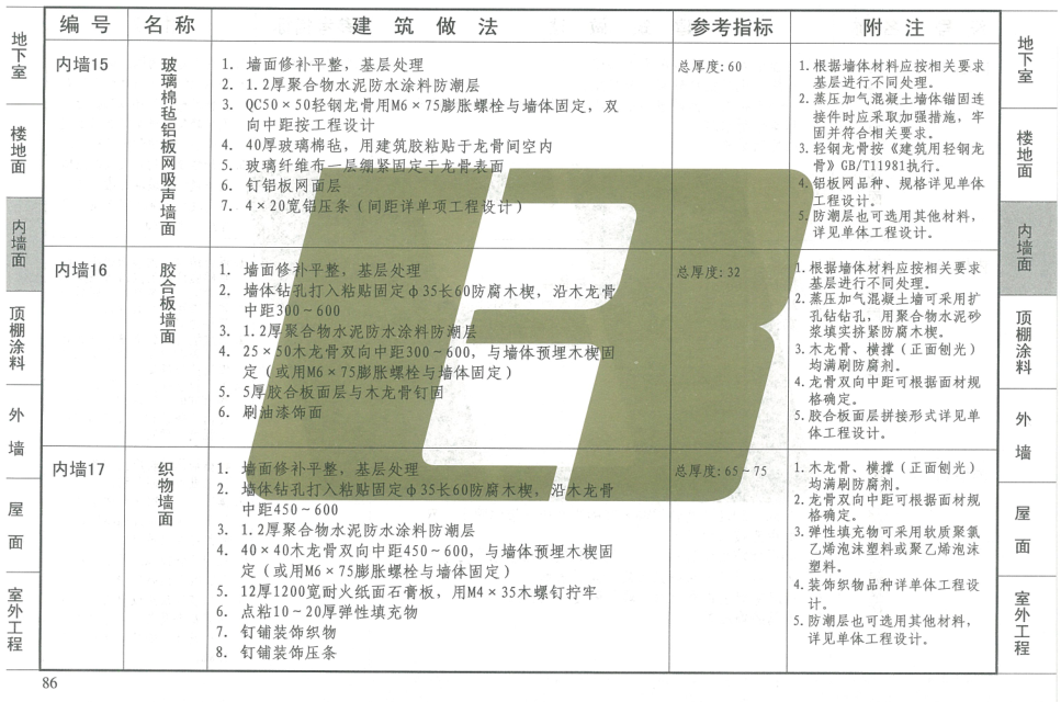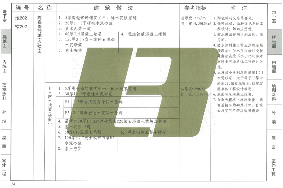 本图集包括地下室及水池防水,楼地面,踢脚、墙裙、内墙,顶棚,涂料、刷浆、裱糊,外墙,屋面,散水、台阶、坡道,道路、场地等九个部分的构造用料做法。