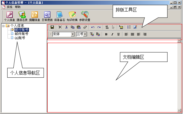 个人信息导航区为一树形结构,简便实用,可根据自已的意愿,设计自已的树目录结构,对信息动态进行分类,方便查找。