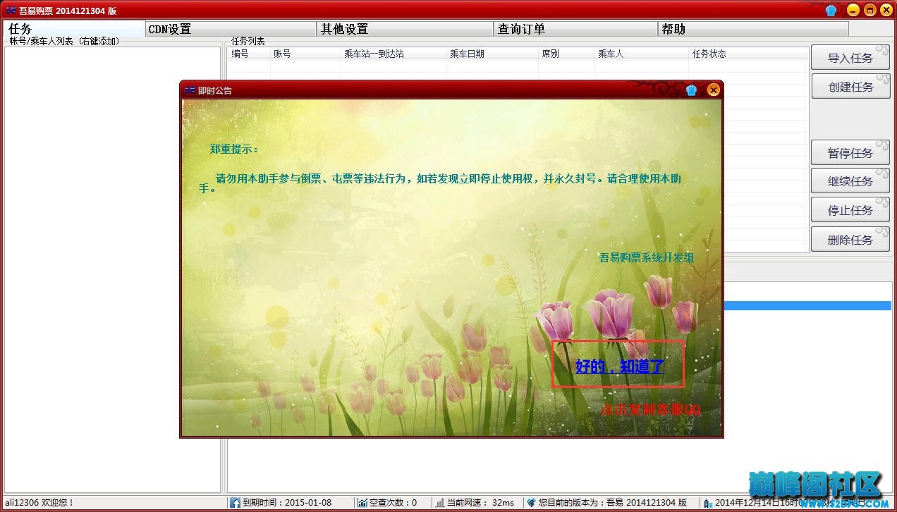 吾易购票软件是一款专业的火车票抢票、购票软件。软件是收费的,这里小编为大家嗲了破解版的,7月26号更新,完美无限制使用。尽管现在还不是抢票的时节,但是先备着也是不错的。如果需要就拿去吧!