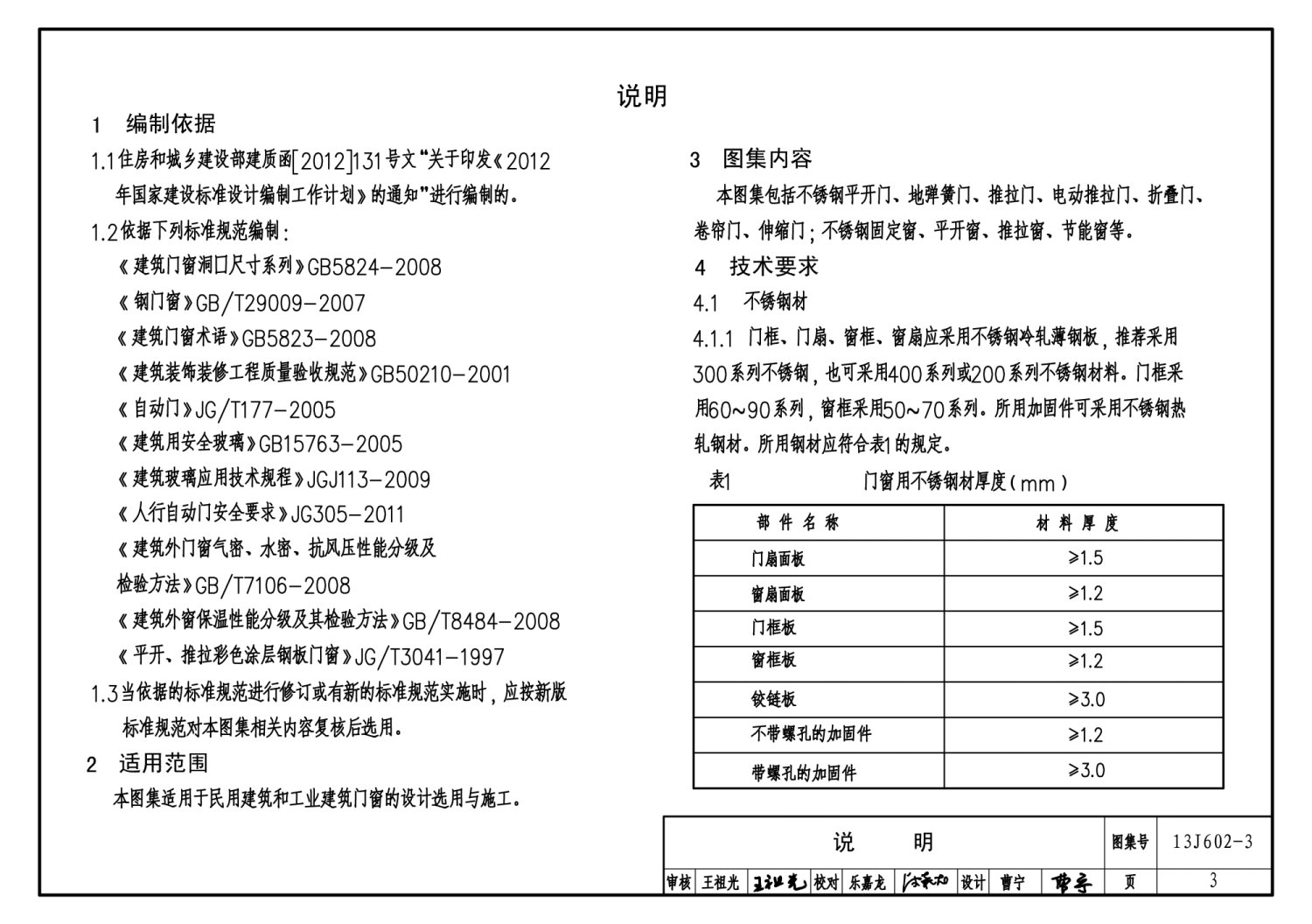 图集内容主要包括不锈钢平开门、地弹簧门、推拉门、折叠门、卷帘门、连窗门、伸缩门7种门型,以及不锈钢平开窗、固定窗、推拉窗、节能窗4种窗型的选用表、构造图和安装节点详图。
