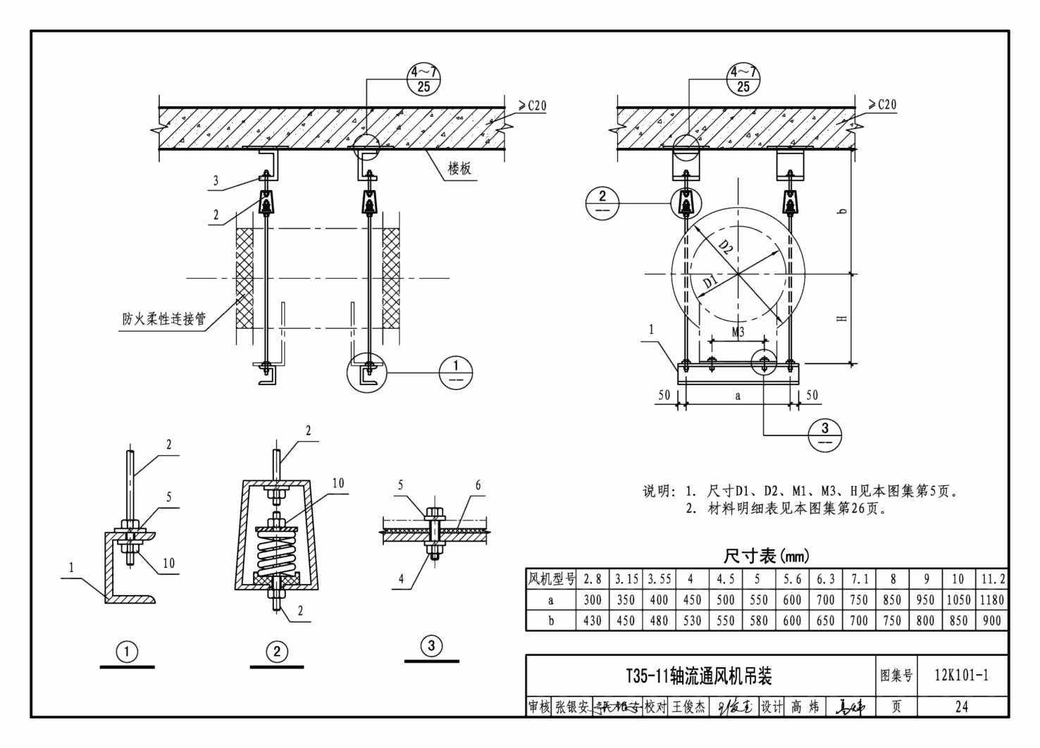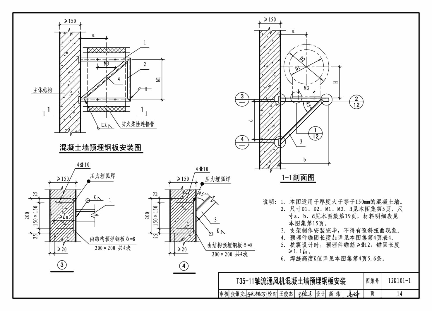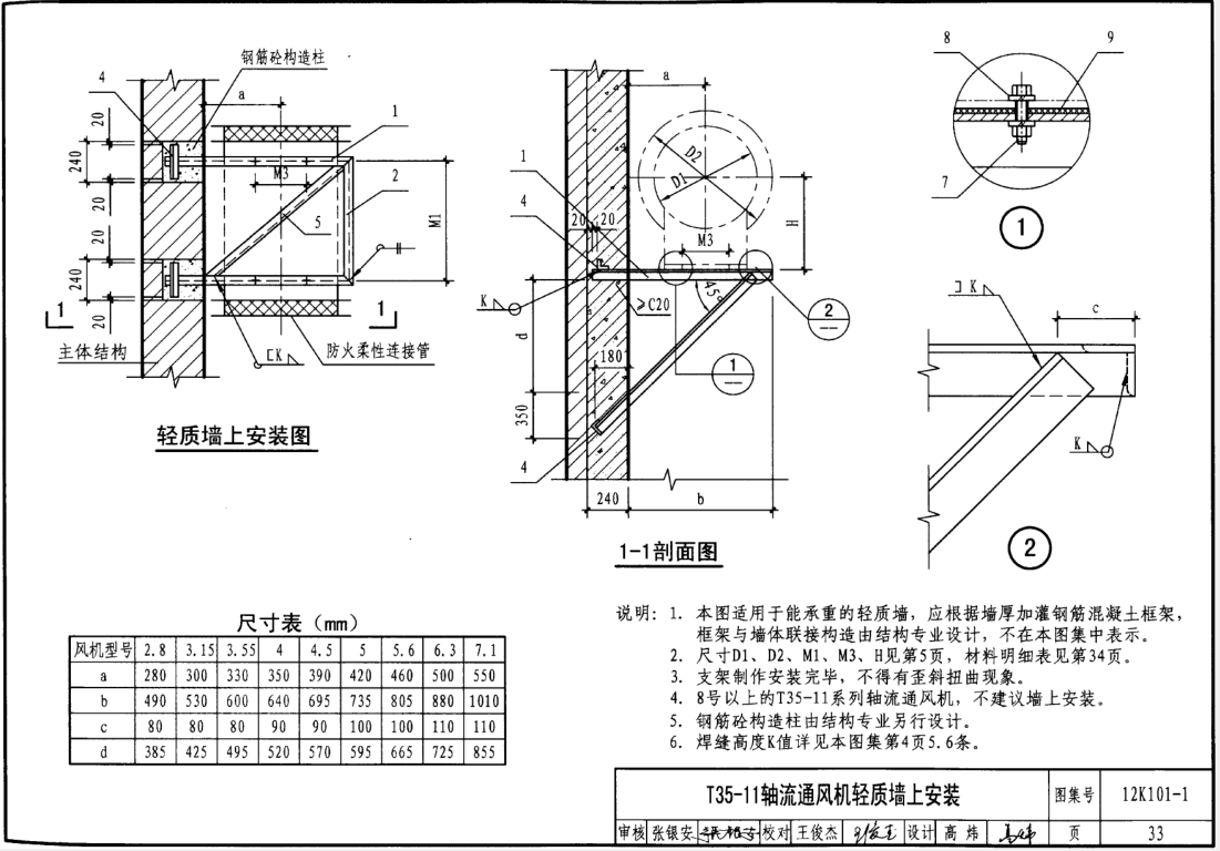 12K101-1《轴流通风机安装》,修编图集,系轴流通风机及附件安装图集,主要内容包括T35-11系列轴流风机安装、常用附件安装及导翼型轴流风机安装。具体安装方式有墙(含轻质墙)、柱上安装;吊装;落地安装;屋面安装及穿屋面做法;轻钢结构建筑上的安装等。修编图集在原图集基础上增加了多种安装方式,基本涵盖目前风机安装常用做法,风机型号也由7.1号扩展到11.2号,且都给出了安装详图,并配有相关的结构配筋图,数据详尽,设计人员可直接选用、施工人员可照图施工。