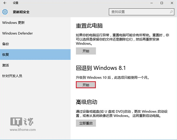 1、打开设置→更新和安全→恢复,找到“回退到Windows7(或Windows 8.1)”,点击“开始”。