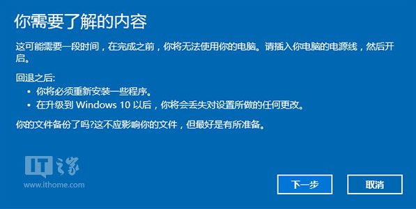 3、仔细阅读注意事项,全过程需要有稳定电源支持,也就是说笔记本和平板电脑需要在接入电源线的状态下进行回退操作,电池模式不被允许;另外,系统还提示了一些关于文件和程序可能受到的影响。了解并采取措施之后,点击“下一步”继续。