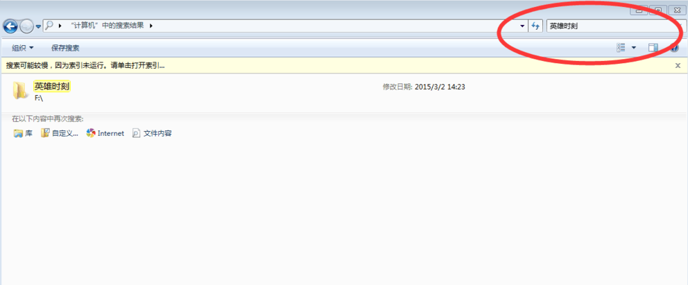 打开“计算机”,在右上角搜索“英雄时刻”,便会出现文件夹“英雄时刻”的位置,记住。