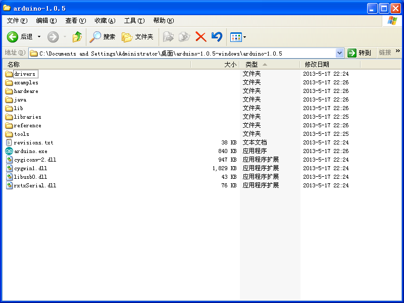 找到你下载的压缩版(arduino-1.0.5-windows.zip),解压到任意位置,(笔者解压到桌面),打开此文件夹,如图所示: