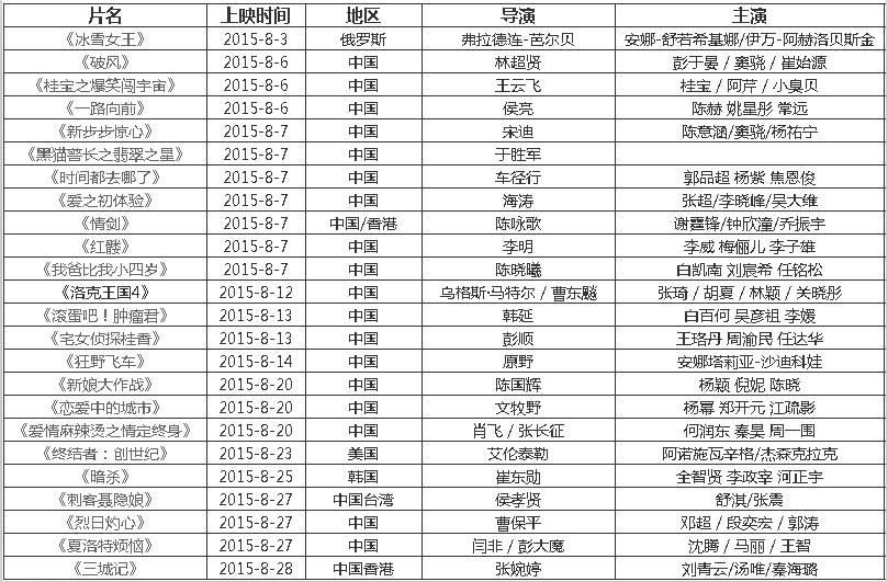这个八月,你最想看哪部电影呢?是是冰雪女王还是白雪公主呢?是终结者创世纪还是狂野飞车呢?亦或者是破风?新娘大作战?……本节内容东坡小编为大家整理带来的是一份全国内地院线2015年8月份电影上映时间表,如果你想知道在这个八月有哪些大片要上映,如果你想知道你所期待的电影什么时候开始上映,那么就快来速度围观这份免费高清版的2015年8月电影排片表,片名、上映时间、导演、主演什么的一目了然,小编觉得有需要的朋友可以将这份2015年8月电影排片表收藏在手机里哦!你觉得呢?