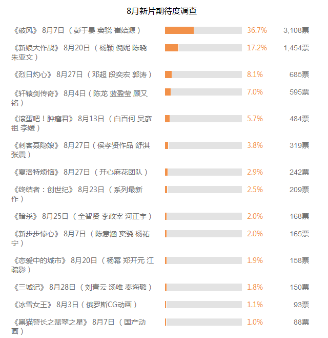 以下是2015年8月电影新片期待度调查表,感兴趣的朋友们可以了解一下哦!