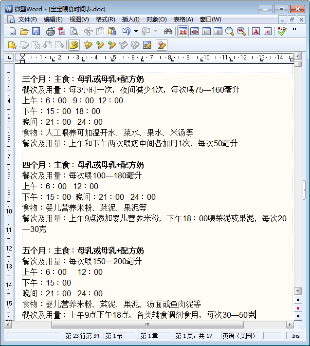 本节内容东坡小编为大家整理带来的是一份word打印版宝宝喂食时间表,小编觉得这是一份新晋爸妈必不可少的资料之一,除了宝宝喂食时间表外,这份word文档中还包含有婴儿辅食制作方法及相关说明,是一份内容十分详细且完整的婴儿喂养指南,以下是关于该婴儿喂养指南的介绍,需要下载或是查阅更多该资料内容的朋友们欢迎点击本文相应的下载地址进行下载查阅!