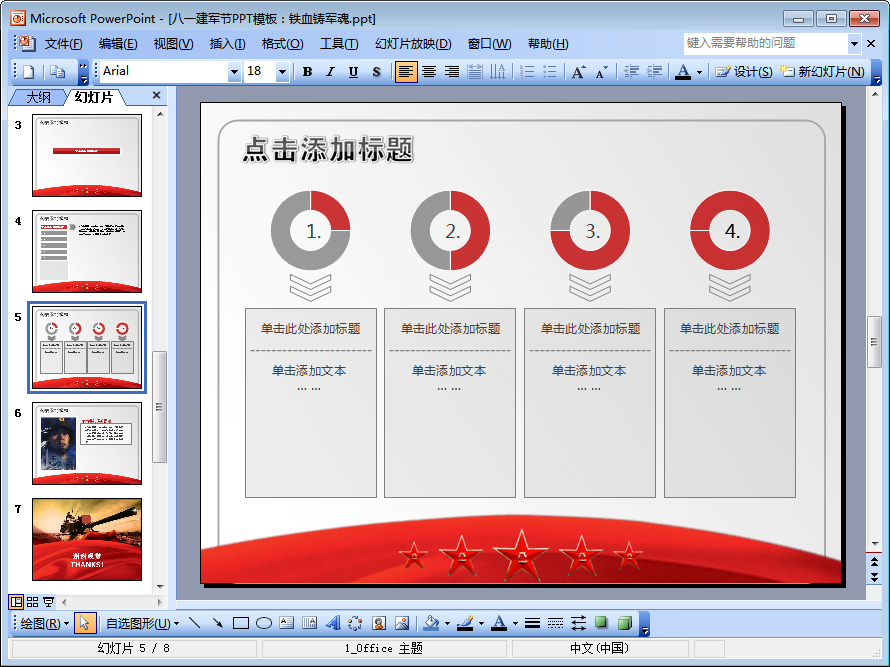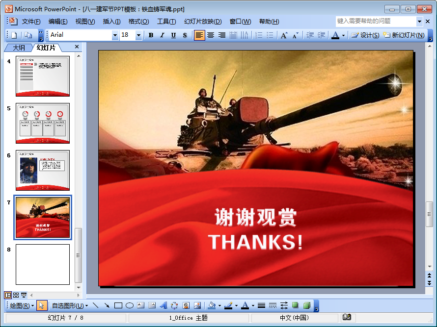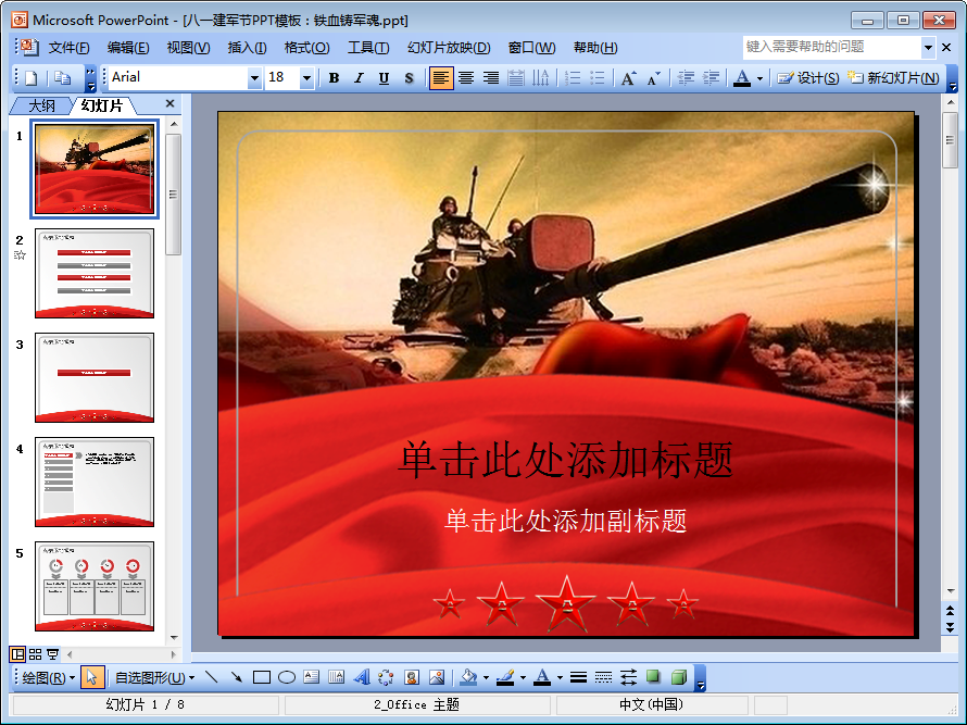 这是一份以八一建军节为主题而设计的PPT模板,更准确一点来说这是一份名为“铁血铸军魂”的八一建军节PPT模板,火热的军营,铁血的忠诚!如果你需要一份八一建军节主题PPT模板的话,那就不妨来参考一下该ppt模板素材吧!
