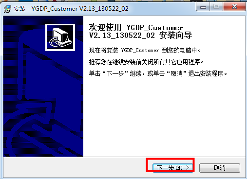1、安装 YGDP_Setup_V2.13_130522_02_Customer.exe,按照提示点击下一步完成即可,Windows7及64位系统如遇兼容性问题可以Windows XP SP3兼容模式运行。
