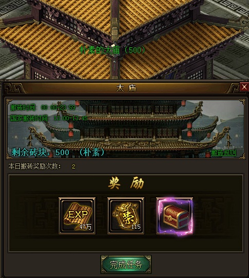 玩家军衔等级到达都尉后,每天可以在国家战事界面快速接取2次任务。任务需要玩家在规定时间内偷取敌国砖块,并且提交到本国太庙。同时敌国玩家也有隐藏的任务—保护太庙,敌国玩家击杀偷取本国砖块的玩家,将会完成任务并获得奖励。在王城守卫和玩家保护下,玩家偷取砖块只能智取不可强攻。
