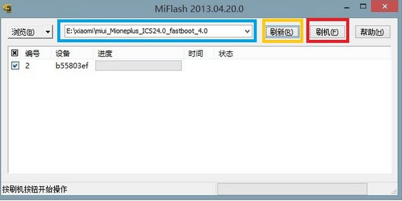 5、再点击黄色的部分,刷机软件,就会自动检索到手机了,再点击红色的部分就开始刷机了