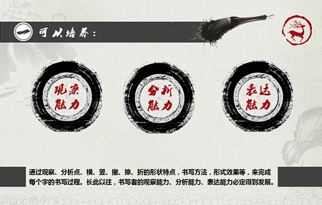 通过观察、分析点、横、竖、撇、捺、折的形状特点,书写方法,形式效果等,来完成每个字的书写过程。长此以往,书写者的观察能力、分析能力、表达能力必定得到发展。