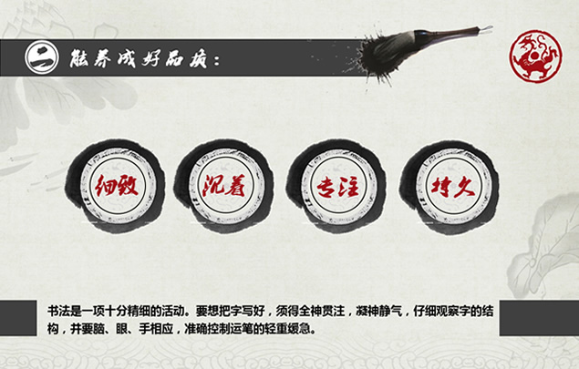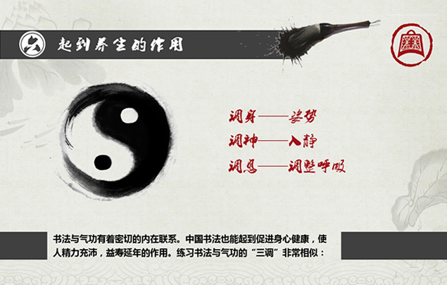 书法是中国特有的传统艺术,学习书法有很多的好处,可以培养我们的艺术修养,对中华民族文化的热爱,东坡小编带来一份学习书法的六大好处ppt,ppt采用的是精美素雅水墨中国风,喜欢的朋友快来下载吧。