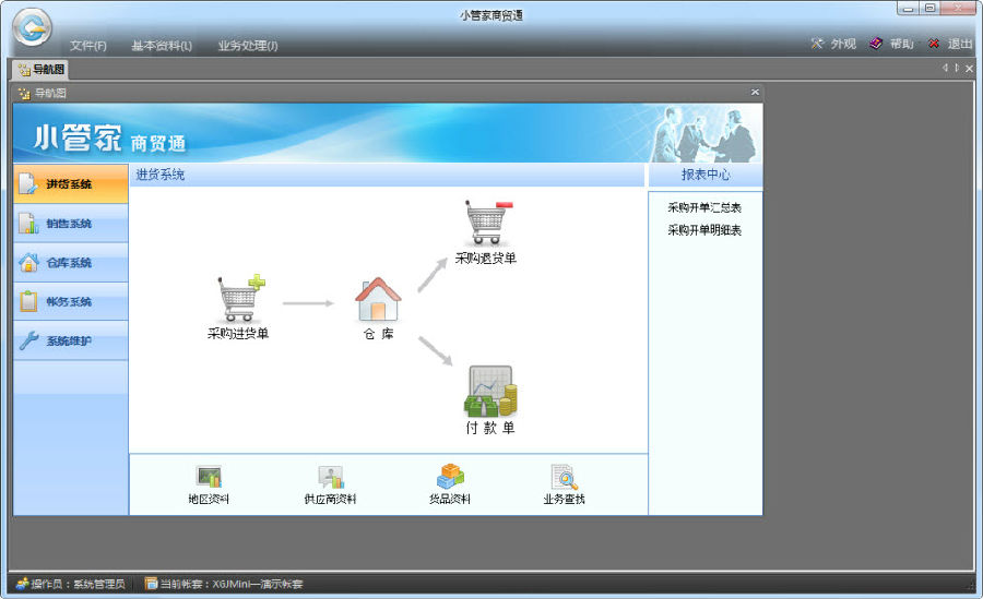 小管家商贸通进销存软件,是一款整合了采购、销售、仓库、财务四方面为一体的单机版企业管理软件。软件系统功能齐全,界面简洁,流程清晰,易学易用,各模块可以DIY,打印送货单样式齐全,也可以自己轻易设计自己所要的打印模板样式。报表从总到分再到原始单据,轻松查找,一目了然。无需专门培训,安装即会用。