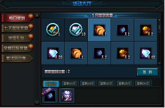 当累计签到达到一定次数,可以领取一份额外奖励。VIP玩家还可以领取到双倍哦!