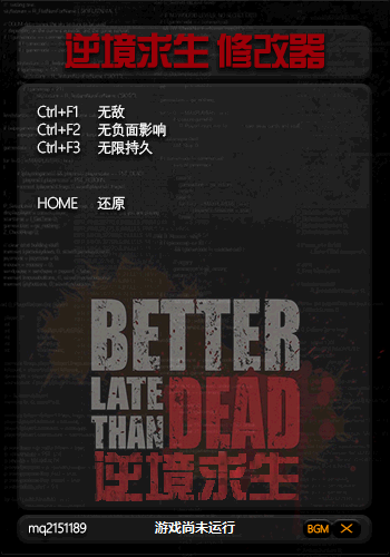 《逆境求生》两项修改器,支持最新0.11.9版本游戏,CH制作,具有无限生命,不受状态影响功能,使用时先运行游戏,再启动修改器。