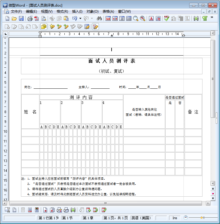 这是一份doc格式word版员工测评表格之面试人员测评表参考模板,它是HR必备工具之一,以下有关于该表格的使用注意事项及表格预览图,需要下载使用这份面试人员测评表的朋友们点击本文相应的下载地址进行下载即可!