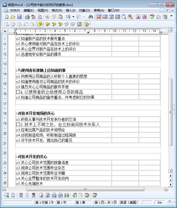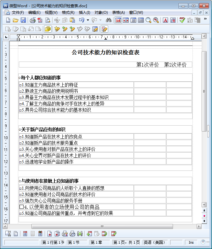 公司员工技术能力知识检查表其实是一种类似于员工测评表的表格,它旨在了解该员工对公司技术能力知识的了解和掌握,本节内容东坡小编为大家整理带来的这份公司员工技术能力知识检查表由“每个人都应知道的事”、“关于新产品应有的知识”、“与使用者在接触上应知道的事”、“对技术开发现场的关心”、“对技术开发的关心”五大项构成,每一个项别都十分详细完整,以下是关于该word打印版员工测评表的相关介绍,需要下载得朋友们点击本文相应的下载地址进行下载即可!