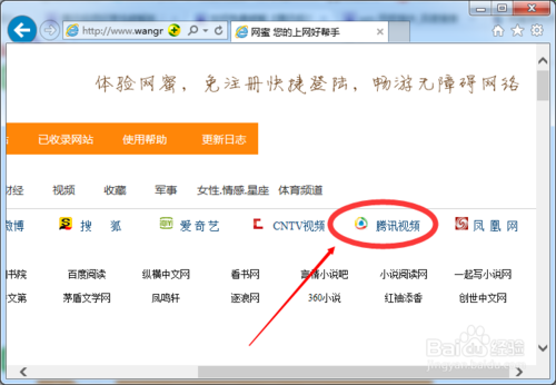 此时将自动打开“网密”官方网站,从中找到“腾讯视频”链接进入。同时当IE浏览器最下方出现“加载项”启用窗口时,直接点击“允许”按钮。