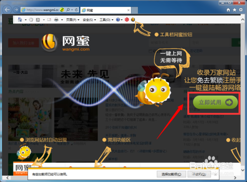 下载并安装“网密助手”完成后,运行此工具,将自动打开IE浏览器并显示如图所示的界面,从其界面中点击“立即试用”按钮。