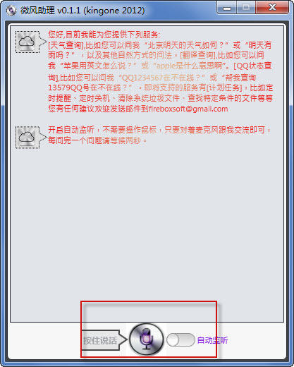 Siri微风助理是一款小巧精妙的语音自动聊天软件,它是一个国产开发的自定聊天语音,跟智能手机上的智能语音软件有点相似,国产的东西别期待太高,不过问问它天气情况还是可以的,识别率也不错!但是真心低智能。