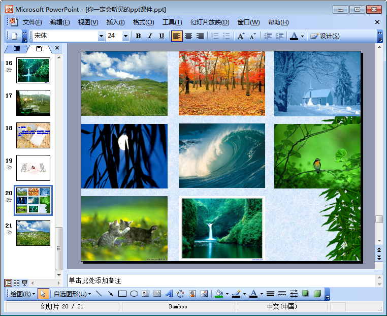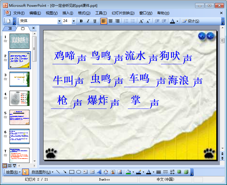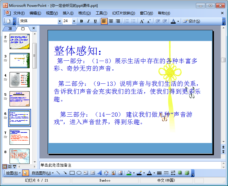 这是一份由21页组成的你一定会听见的ppt课件,该ppt课件内容十分完整全面,且图文并茂,是一份不可多得的优质课件,如果你需要这样一份语文ppt课件的话,那就赶紧来东坡小镇吧!该你一定会听见的ppt课件完全免费,有需要的朋友可放心下载哦!