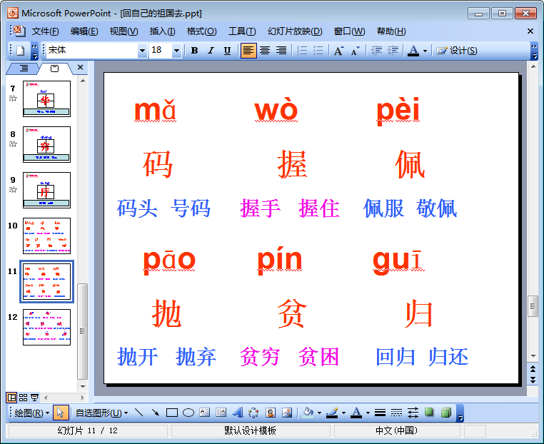 回自己的祖国去是北师大版三年级语文上册第三单元的第二篇课文,本节内容东坡小编为大家整理带来的是该课文的教学设计之生字教学课件,以下有该ppt课件的预览图及相关介绍,需要这份由12页组成的回自己的祖国去ppt课件的朋友们点击本文相应的下载地址进行下载即可!