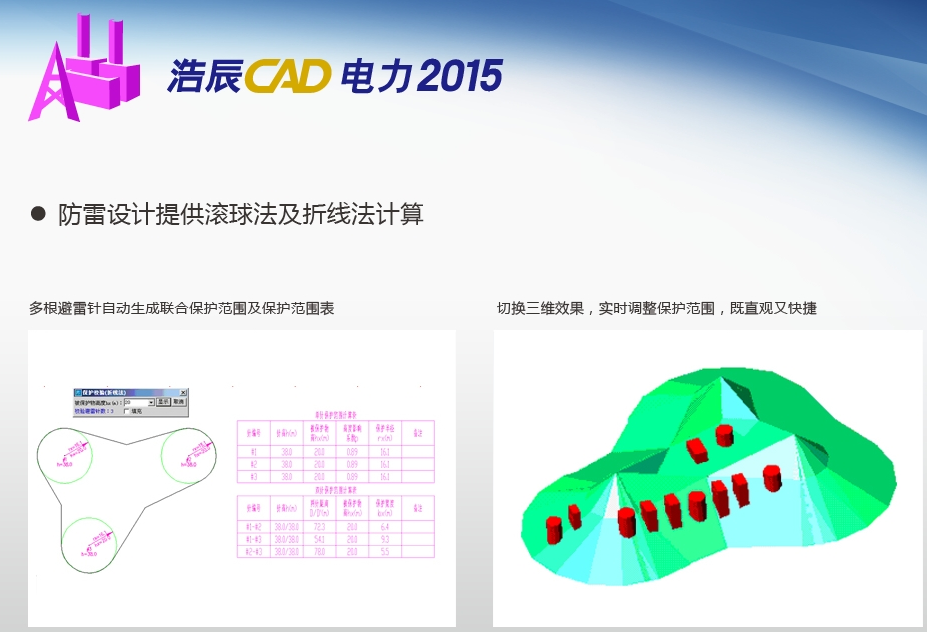 1.快速布置避雷针、同步校核被保护物任意高度的保护情况,直观显示保护范围。
