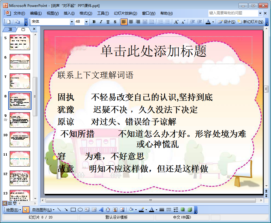该说声对不起ppt课件共由20页组成,虽然整个ppt都选用的是同一张背景图,但在内容上这份ppt课件却是十分详细,除了列出了该课文的自学要求外,其中对于生字词的教学也十分完整,是一份教师引导学生理解说声对不起这篇课文不可或缺的资料,有需要的朋友点击本文相应的下载地址即可进行下载查阅该课件的全部内容哦!