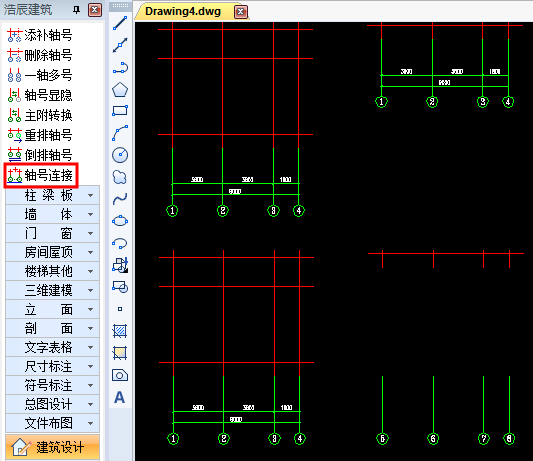 将多个平行的轴号对象连接为一个轴号对象,要求这些轴号对象之间没有交角,连接时以第一个轴号位置为对齐基准,排序方向和起始序号参考第一个轴号对象。