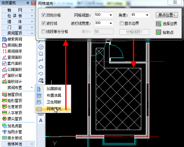 本命令提供了网格和条形图案的对象填充功能,与AutoCAD图案填充比,本命令生成的网格对象操作方便,满足室内设计和建筑设计的天花板和地板、地砖、墙砖等复杂图案排列需求。