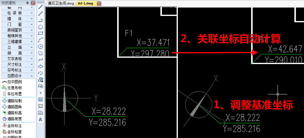 按《总图制图标准》GB/T50103-2010的要求,在总平面图上标注测量坐标或者施工坐标,坐标取值的依据是用户定义的基准坐标。