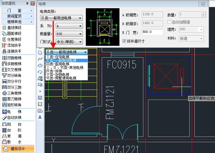 支持一个电梯井道安装多个电梯,之间保留200绘制梁或隔墙的间距。电梯井道假定为矩形。电梯间绘制内容包括绘轿厢,平衡块和门,电梯门形式可选。
