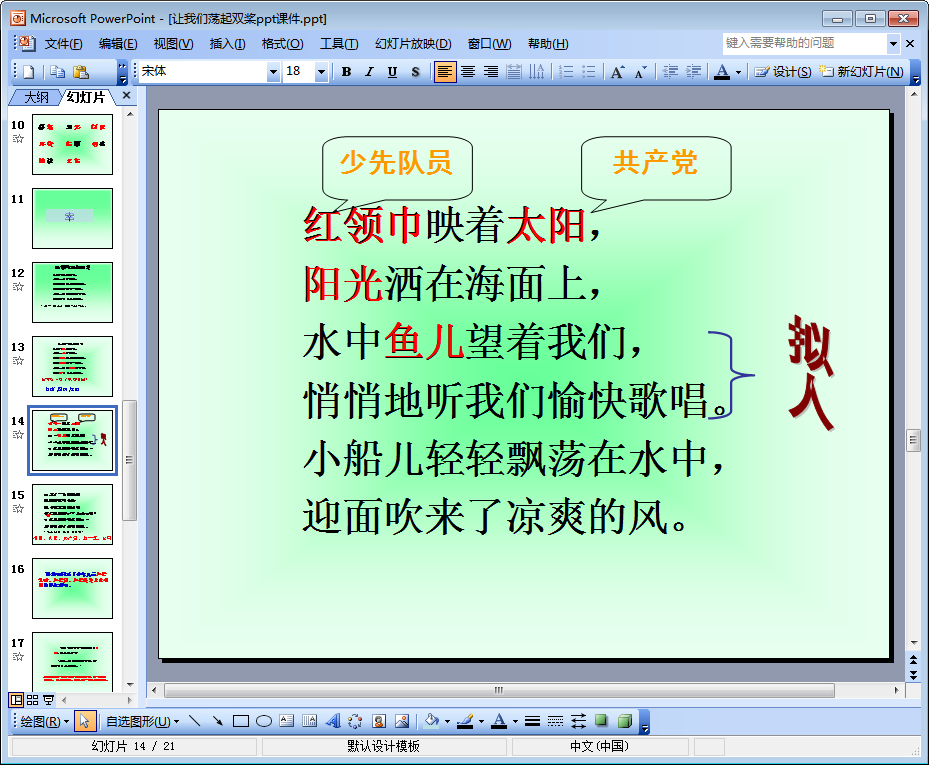 在该让我们荡起双桨ppt课件中,除了有与该课文语境相匹配的配图之外,还有重点词汇的讲解、与课文相关的思考问答等,是一份非常不错的ppt课件,如果你需要这份让我们荡起双桨ppt课件或是需要一份北师大版三年级语文上册课件作为参考否认话,那么不妨就参考一下这份课件吧!内容完整但不冗长,有需要的朋友点击本文相应的下载地址即可进行下载!