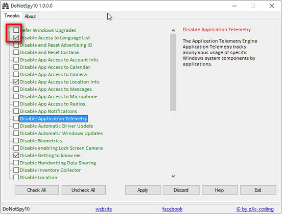 DoNotSpy10 对包括禁用其他应用使用摄像头、禁用应用通知、禁止共享手写内容、禁止系统自动升级等提供了禁用设置,工具提供了 30 多项不同的设置,原理是通过修改注册表来实现修改隐藏设定的,所以在修改前最好先进行系统还原点的创建,修改后重启系统。