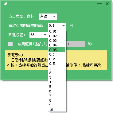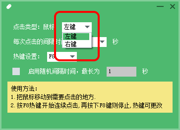 可以自由设置单击鼠标间隔时间及单击方式(左键、右键等),只需要将鼠标移动到需要连点的地方,然后按相应热键就可以启动连点了,再按下相应热键停止。使用非常简单。