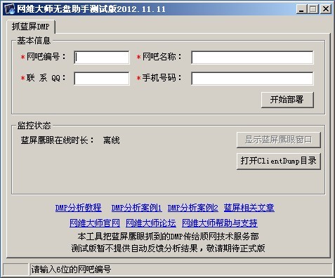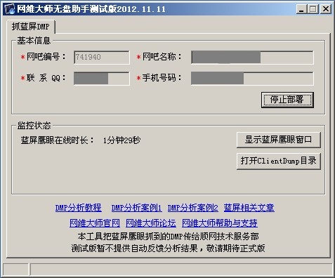 网维大师为了降低用户在遇到蓝屏问题时的处理难度,提升问题解决效率,耗时近半年时间开发出一款用于无盘客户机蓝屏dump收集的工具,该工具可实现在网维大师系统虚拟盘(网维无盘)上收集客户机蓝屏dump文件。只要用户在无盘主服务器上部署好该工具,当客户机有蓝屏时,客户机会自动上报dump文件到无盘主服务器上,用户只需要将系统虚拟盘安装目录下的ClientDump目录打包提供给顺网技术服务部,技术工程师便可帮助大家分析蓝屏原因,给出解决建议。