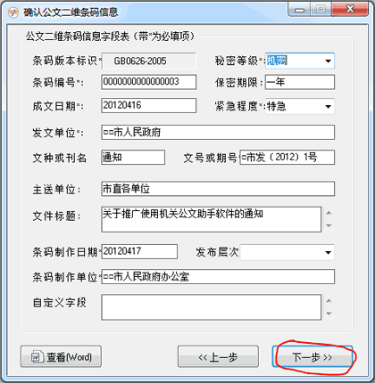在确认公文二维条码界面,程序将自动调用上一步所包含的信息,请按单位实际情况作补充、调整。