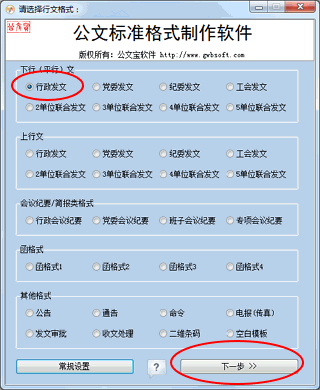 第一步,运行公文标准格式制作软件(机关公文助手),在程序的主界面,请选择相应的行文格式,然后点击[下一步]按钮(如下图)。