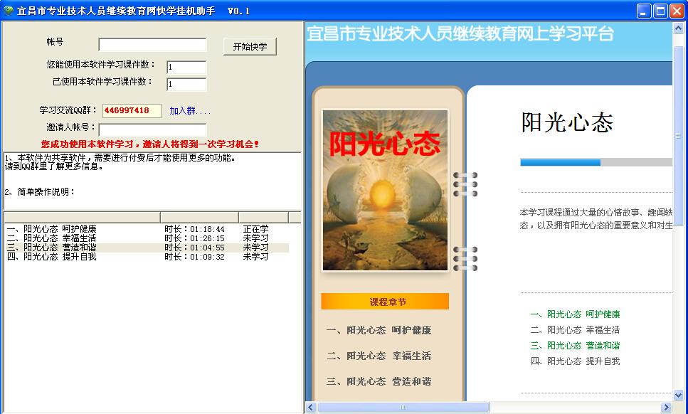 宜昌市专业技术人员继续教育网快学挂机助手是一款帮助学员们在继续教育网网上在线学习是挂机辅助工具,这款工具可以让学员们不用时刻都要守在电脑点击鼠标,这样可以轻松、快速的完成宜昌市专业技术人员继续教育网的学习任务。