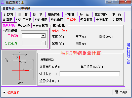 2.T型钢不再是只能靠数据输入,增加热轧T型钢的直接查询,也根据市场情况分为“98版”及“05版”两个版本。