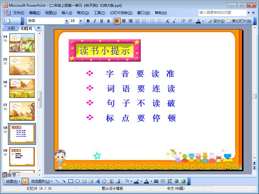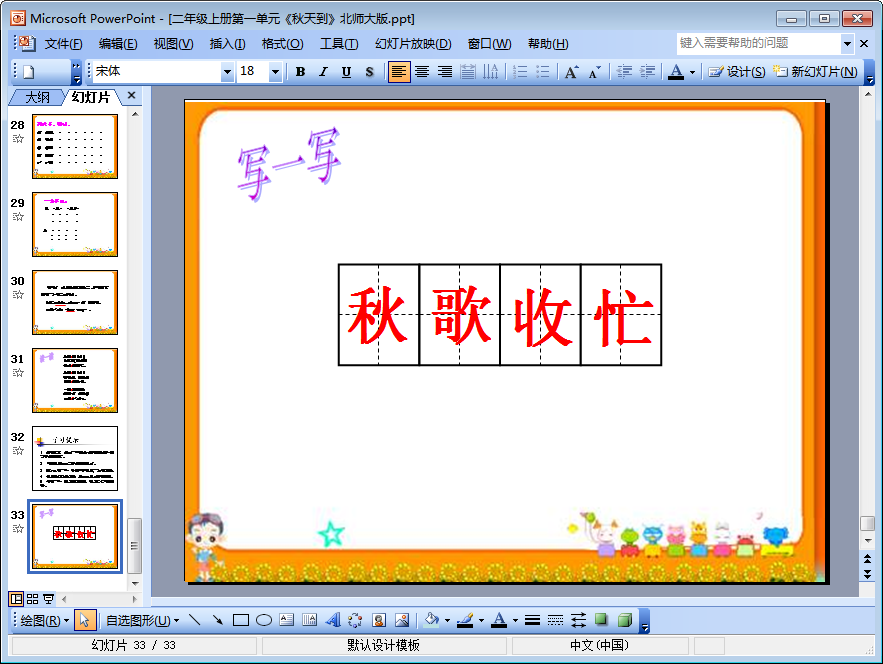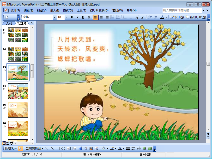 秋天到是小学阶段语文课本中非常重要的一刻,这从北师大版二年级语文上册把它安排在第一单元第一课这一点就不难看出。那么老师应该如何来引导学生来理解这篇课文呢?又该如何来上好这一门课呢?本节内容东坡小编为大家整理带来的是一份秋天到教学设计之由33页组成的秋天到ppt课件,该ppt内容详细,图文并茂,欢迎有需要的朋友前来下载使用该ppt课件!