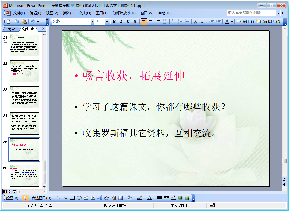这份罗斯福集邮课文ppt课件共有26页,适合作为小学阶段的语文教学课件使用。该ppt课件课件内容包括课文引导、生字词学习,课堂训练以及课后作业布置等,是一份内容十分全面详细的ppt课件,需要这份罗斯福集邮课文ppt课件的朋友们点击本文相应的下载地址进行下载即可!以下是关于该ppt课件的相关介绍,希望对大家有所帮助!