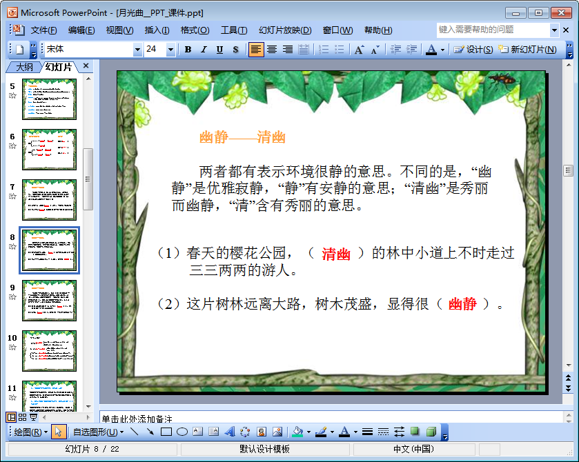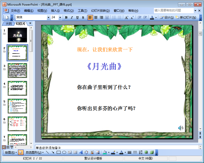 该月光曲课文教学ppt课件旨在让学生理解月光曲这篇课文中的一些重难点字词以及中心思想及主要内容等,ppt共由22页组成,内容完全免费,以下有关于该ppt课件的相关介绍,如果你需要这样一份月光曲ppt作为教学课件的话,点击本文相应的下载地址进行下载即可!